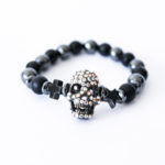 Pulsera elástica de doble vuelta, realizada en cristal facetado gris claro mate y ágata de colores. Lleva una perla cultivada plana y una rosa de plástico color rosa palo, gris o verde a elegir. En tres tamaños 15-17-19cm